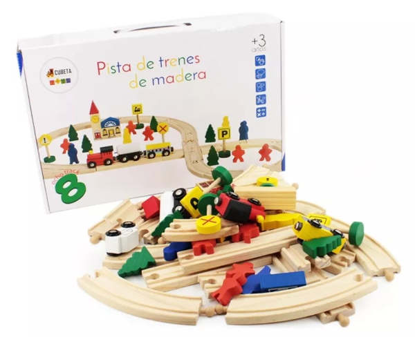 - Incluye: 1 tren (con 3 vagones), 2 edificios, 6 arboles, 10 figuras humanas, 1 ambulancia, 4 señales de transito y 19 rieles.